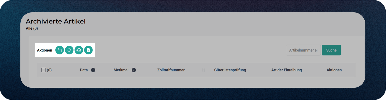 Sie können aus dieser Ansicht außerdem archivierte Artikel wieder in den “aktiven” Zustand versetzen. Sobald der Artikel reaktiviert wird, erfolgt während der nächsten geplanten Prüfung, üblicherweise um Mitternacht, eine Validierung des Zolltarifcodes.