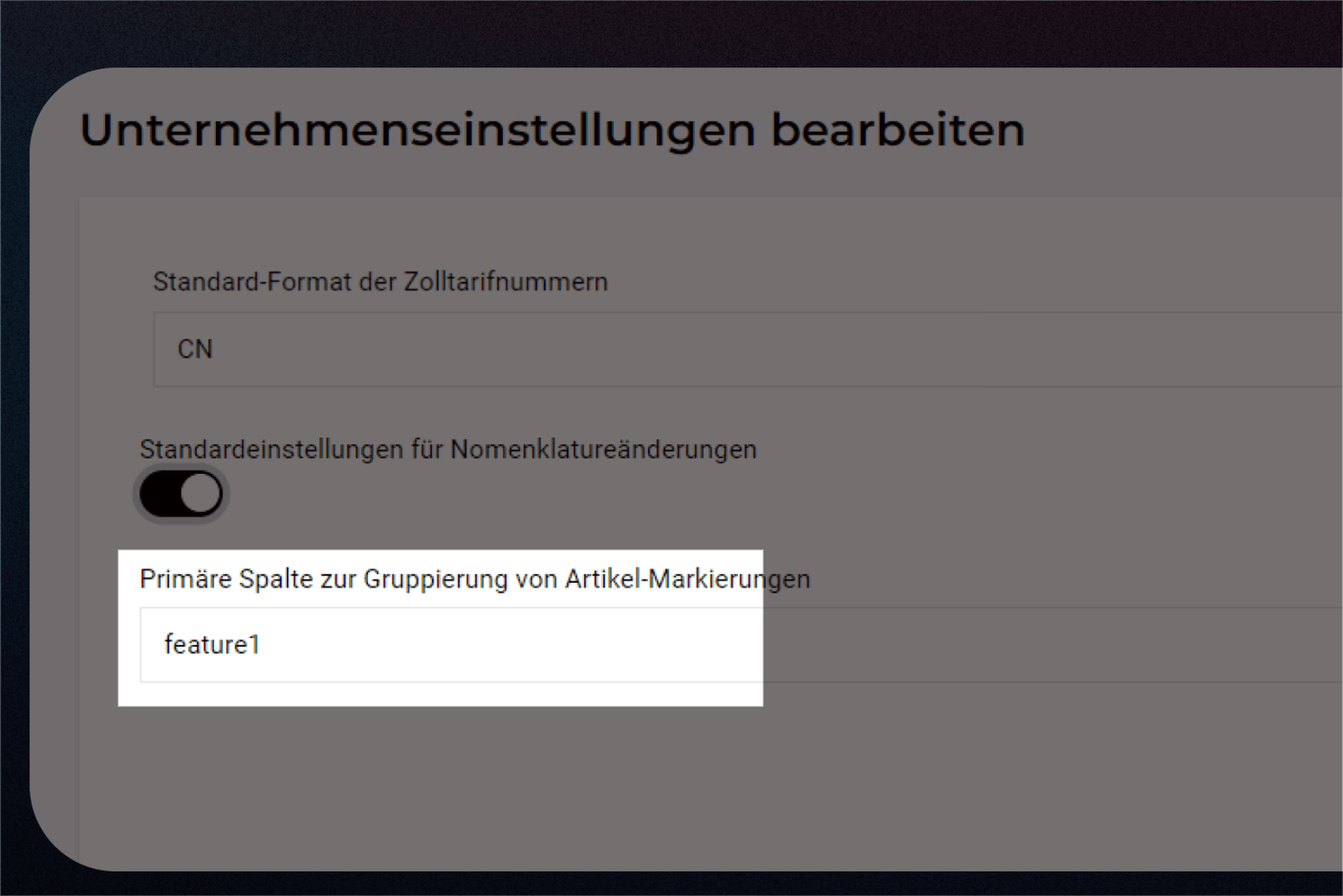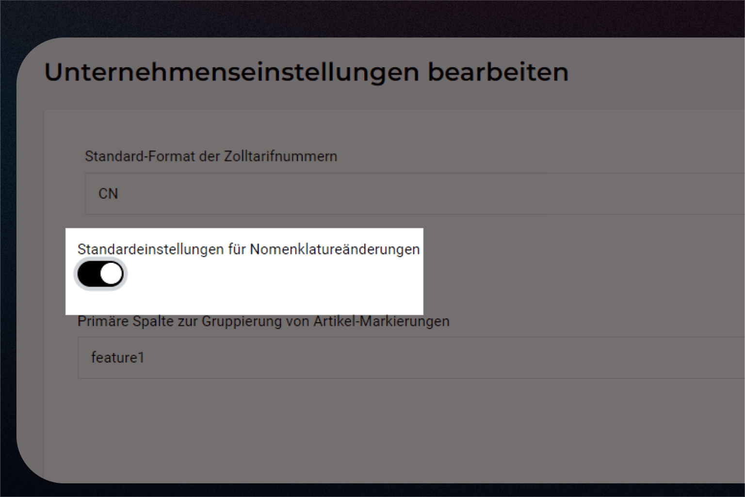 Je nach Rechtsgebiet wählen Sie hier Ihr Standardformat für die Zolltarifnummern aus. Für das Rechtssystem der Europäischen Union wäre dies die Kombinierte Nomenklatur (d. h. die achtstellige Zolltarifnummer) oder der sogenannte TARIC (die zehnstellige Zolltarifnummer), den Sie für Importprozesse benötigen.